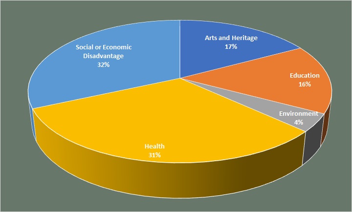 Click here for a detailed list of these grants. See below for a breakdown by category, geographical area and grant size.