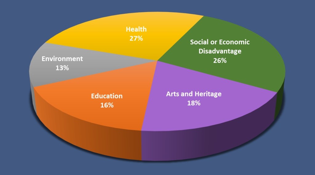 Click here for a detailed list of these grants. See below for a breakdown by category, geographical area and grant size.